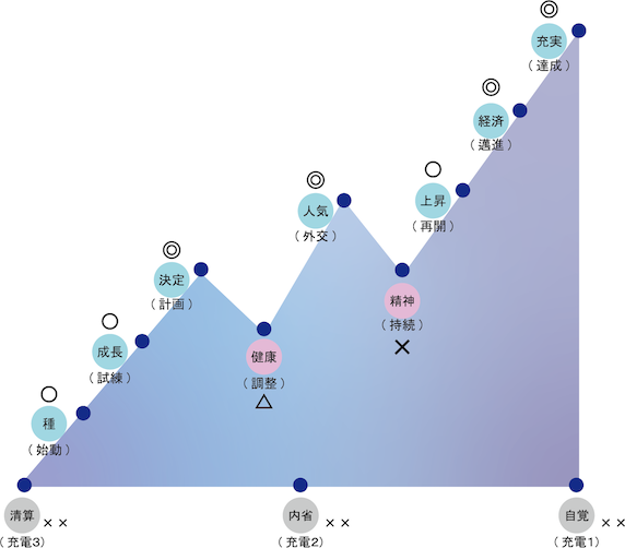 このポジションは、これまでの努力が実を結び、目標やビジョンが達成され、公私ともに充実や安定、安らぎを得られる時期です。【経済(邁進)】では経済活動に特化したものにコミットし、行動しますが、【充実(達成)】ではプライベートも含めた、さまざまな事柄(家を建てる、結婚する、出産するなど)の目標達成が求められます。また、【経済(邁進)】での成果が不十分だと感じる場合や、やるべきことが完了していないときには、ここでも経済活動は継続してください。エネルギーが高い状態ですし、安定しているので、ただ何となく過ごしてしまいがちですが、それは非常にもったいないです。翌【充電1(自覚)】のポジションに入ると、通常30%ほどパワーダウンするものですが、ここでどれだけ行動できたか、備えられたかによって、その割合を軽減することができます。パワーの低下が緩やかになるよう、モチベーションを維持し、積極的に努力し続けることが大切です。